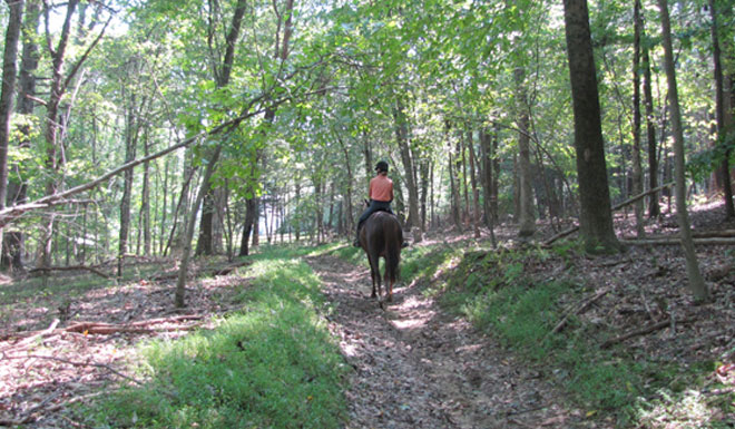 The trail is shared with the Bedford Riding Lanes Association (BRLA) and is parallel to Sunnyfield Farm. Horses are often unfamiliar with mobility devices and other adaptive equipment. To help ensure a safe interaction, speak with the horse in a calm voice so it recognizes you as a person. Ask the horseback rider where you should position yourself to allow the horse to pass safely.